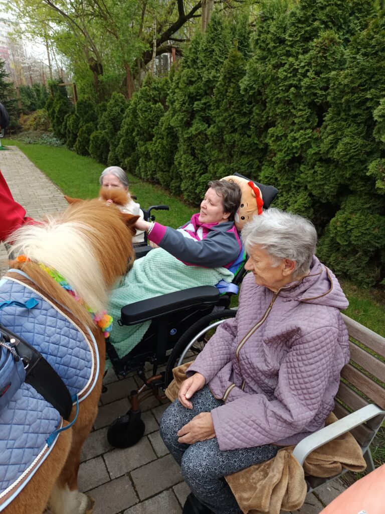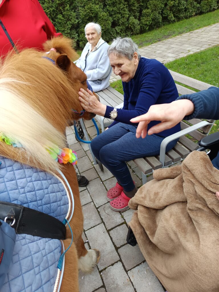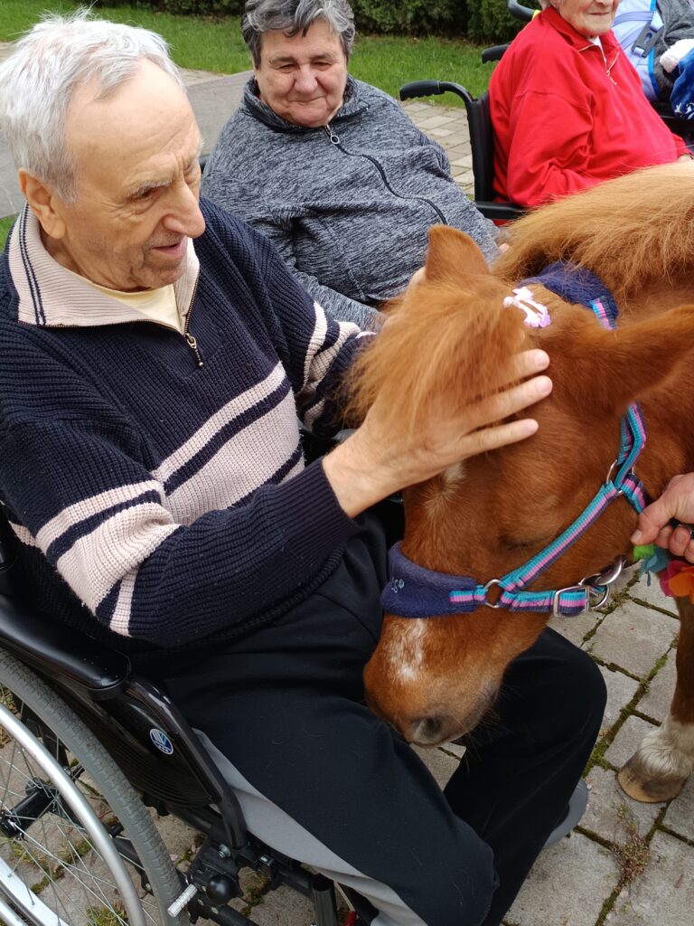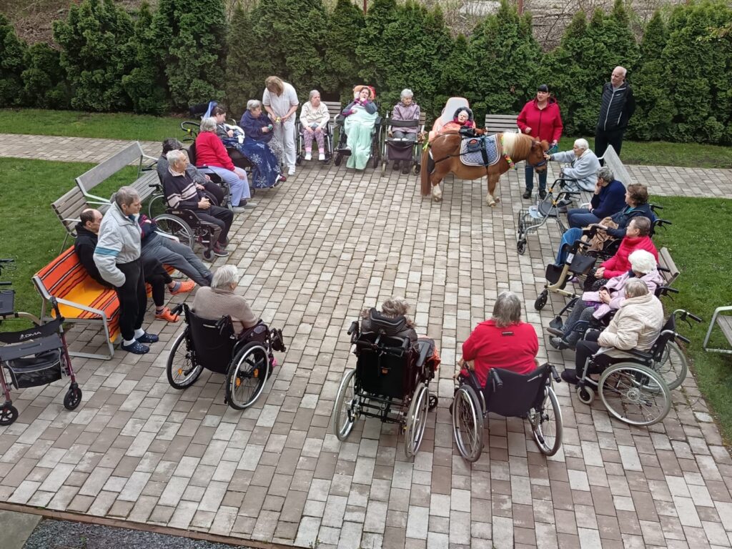 A právě Ondrášek pravidelně navštěvuje i náš domov. I když nám tentokrát počasí příliš nepřálo, na zahradě se nás sešlo opravdu hodně. Paní majitelka nám nejprve poutavě vyprávěla o tomto plemeni i o samotném Ondráškovi – kde je ustájený, čím se krmí, jakou potřebuje péči a co má rád.